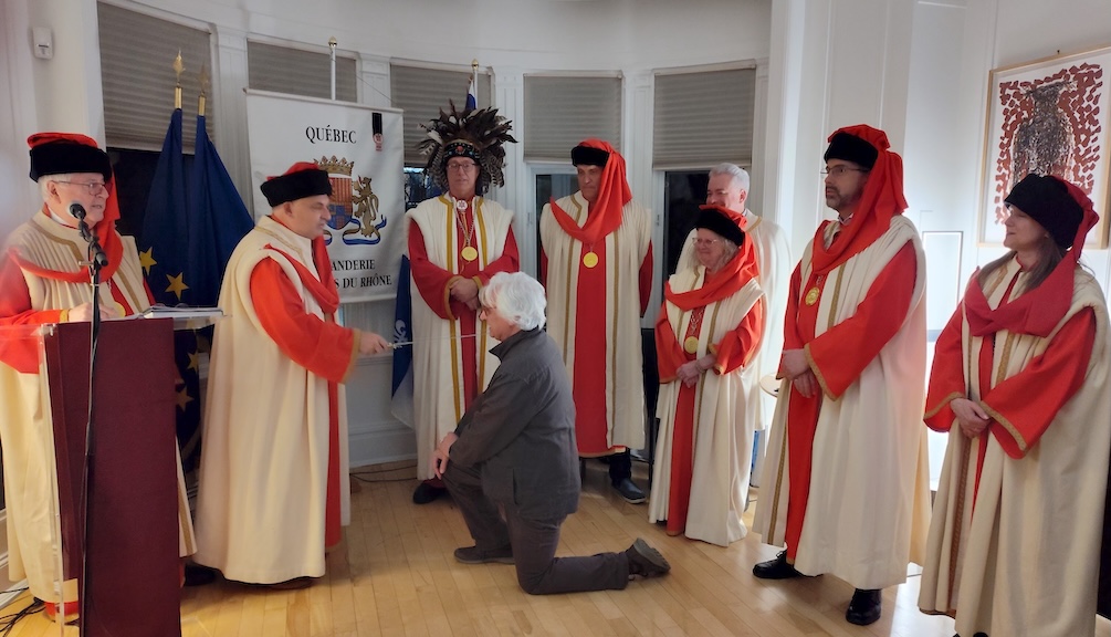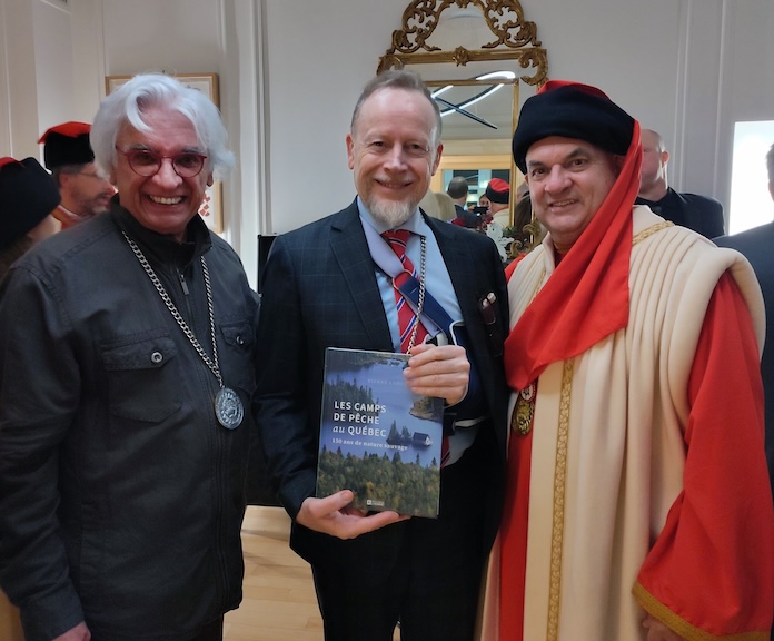 À l’occasion du 117ème chapitre de la Baronnie de Québec, Pierre Lahoud a été adoubé Chevalier. La cérémonie s’est tenue à la résidence du Consul général de France, M. Éric Lamouroux, à qui il fut remis un exemplaire des Camps de pêche au Québec. À droite, M. François Gosselin, Consul de la Baronnerie de Québec.